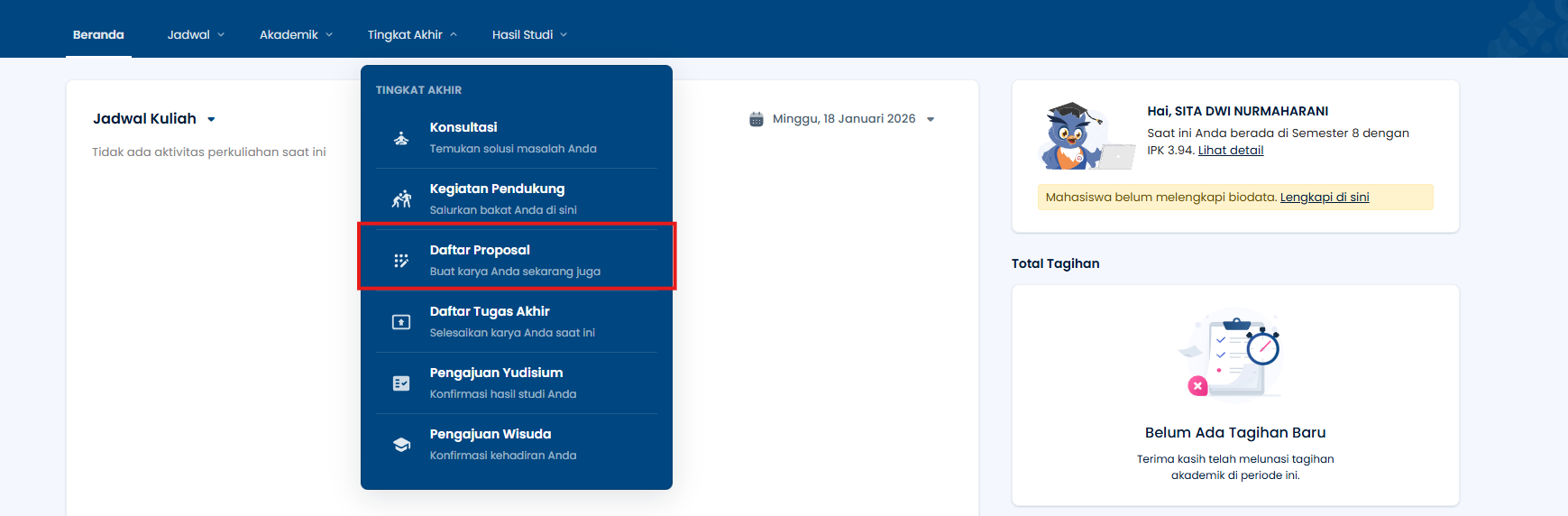 Dengan Cara Login Ke Akun SIM Pilih Menu Tingkat AKhir –> Daftar Proposal